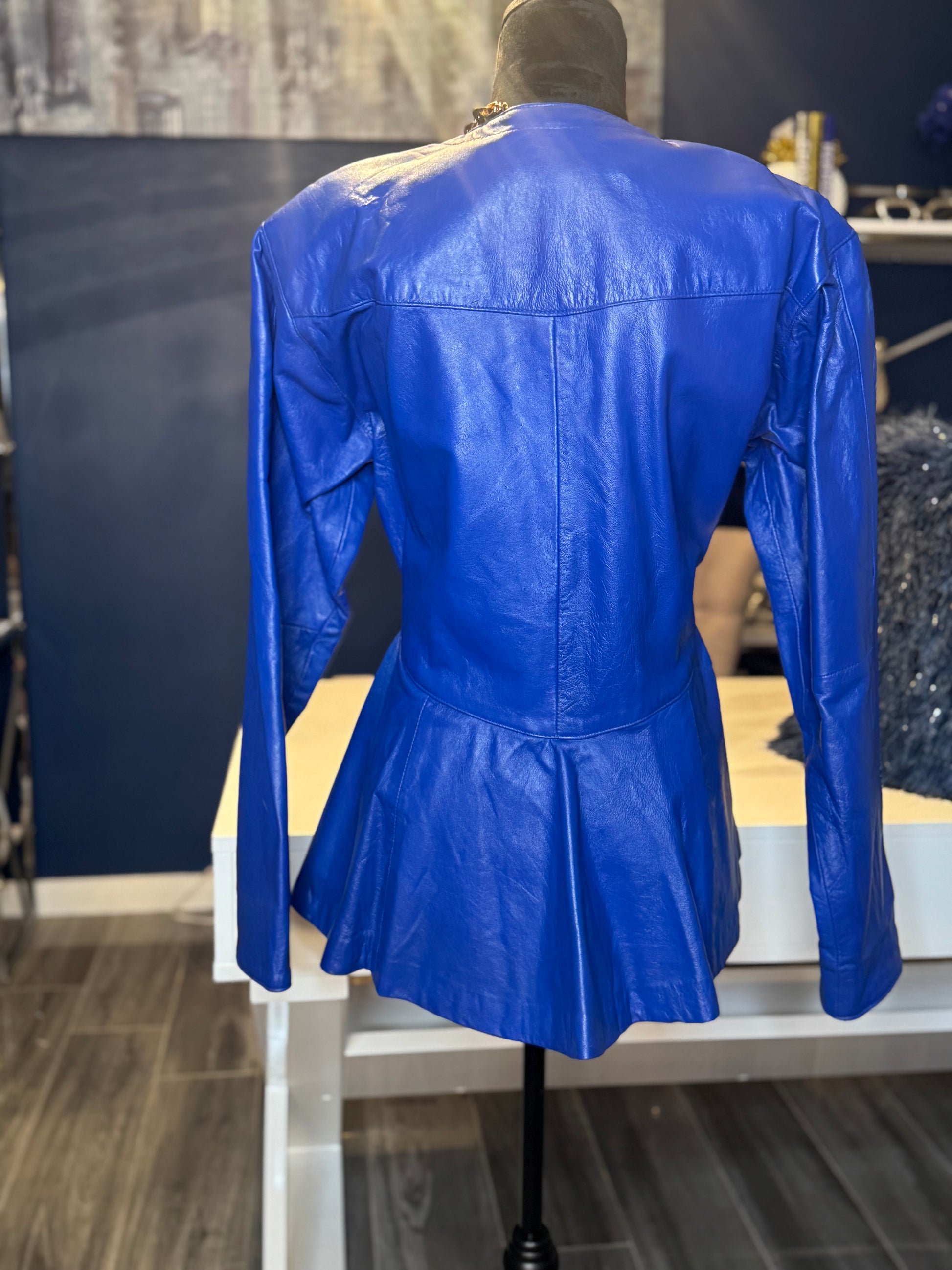 Vintage Electric Blue Leather Peplum Jacket (Size Large/ PTP 21 inches )