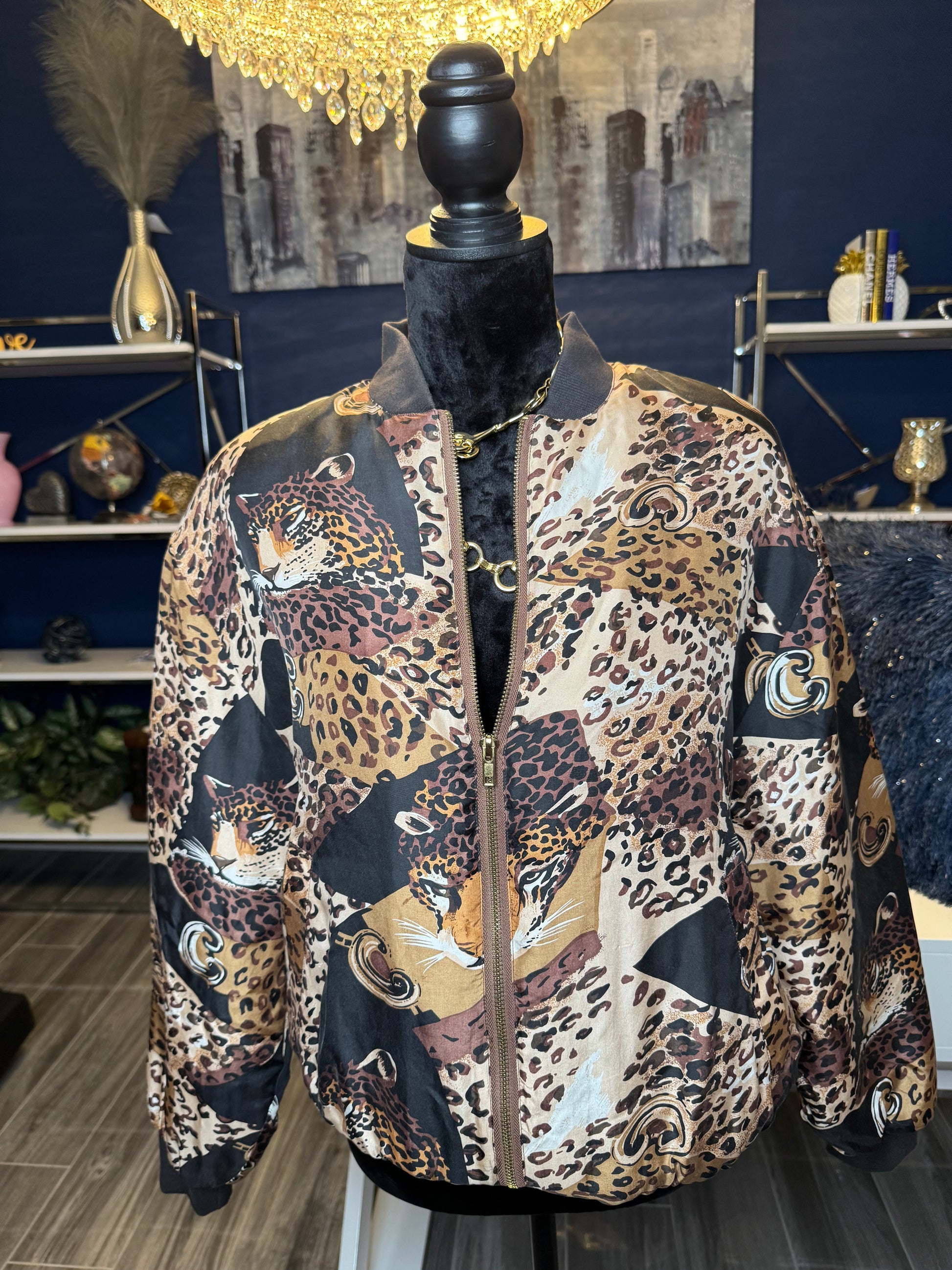 9.19.25 Vintage JJ Arnold Silk Animal Print Bomber Jacker (Size Large)